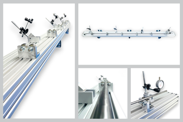 Vier flexibel positionierbare Halterungen sind mit schwenkbaren Messuhren ausgestattet und erlauben eine individuelle Anpassung an das jeweilige Prüfteils. Die Vorrichtung ist für Rundstangen mit einem Durchmesser bis 30 mm ausgelegt.