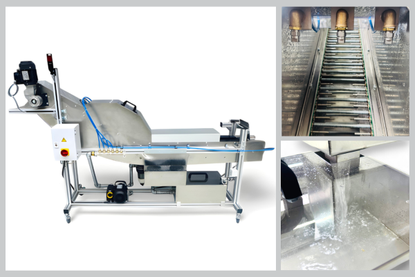 Das Teilereinigungsband reinigt metallische Werkstücke kontinuierlich im Durchlauf. Zwei Rollenketten fördern die Teile sicher durch eine mehrstufige Brauseneinheit, während Späne und Verschmutzungen über den geschlossenen Ölkreislauf abgeschieden werden. Der robuste Rahmen aus rostfreiem Material, ein Untergestell aus Alu-Profilsystemen sowie integrierte Schutzvorrichtungen gewährleisten einen zuverlässigen und wartungsfreundlichen Betrieb.