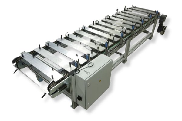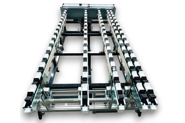 Die präzise Positionierung erfolgt mittels Kettenführung und Kunststoffprismen zur Teileaufnahme. Das stabile Untergestell aus Aluprofilen und Stahlrahmen kann durch Linearschienen in der Breite verstellt werden. Eine Keilwelle synchronisiert die Antriebseinheit.