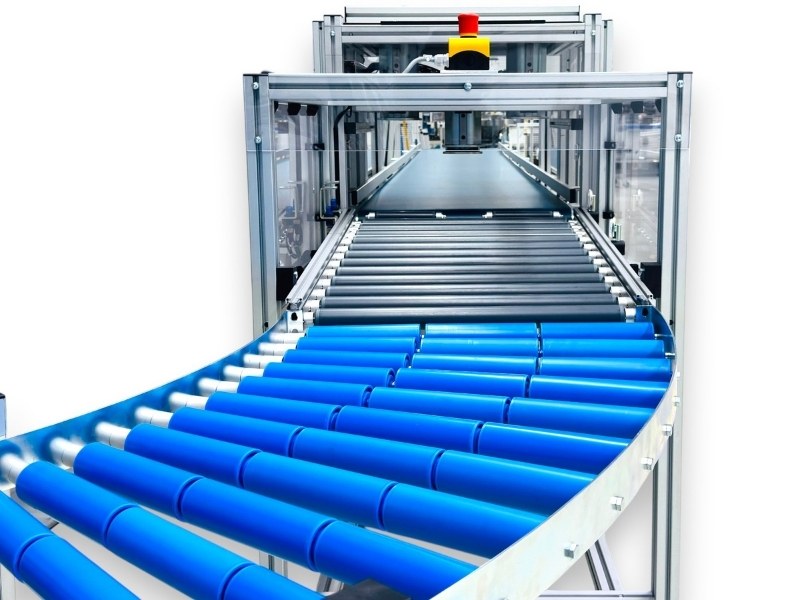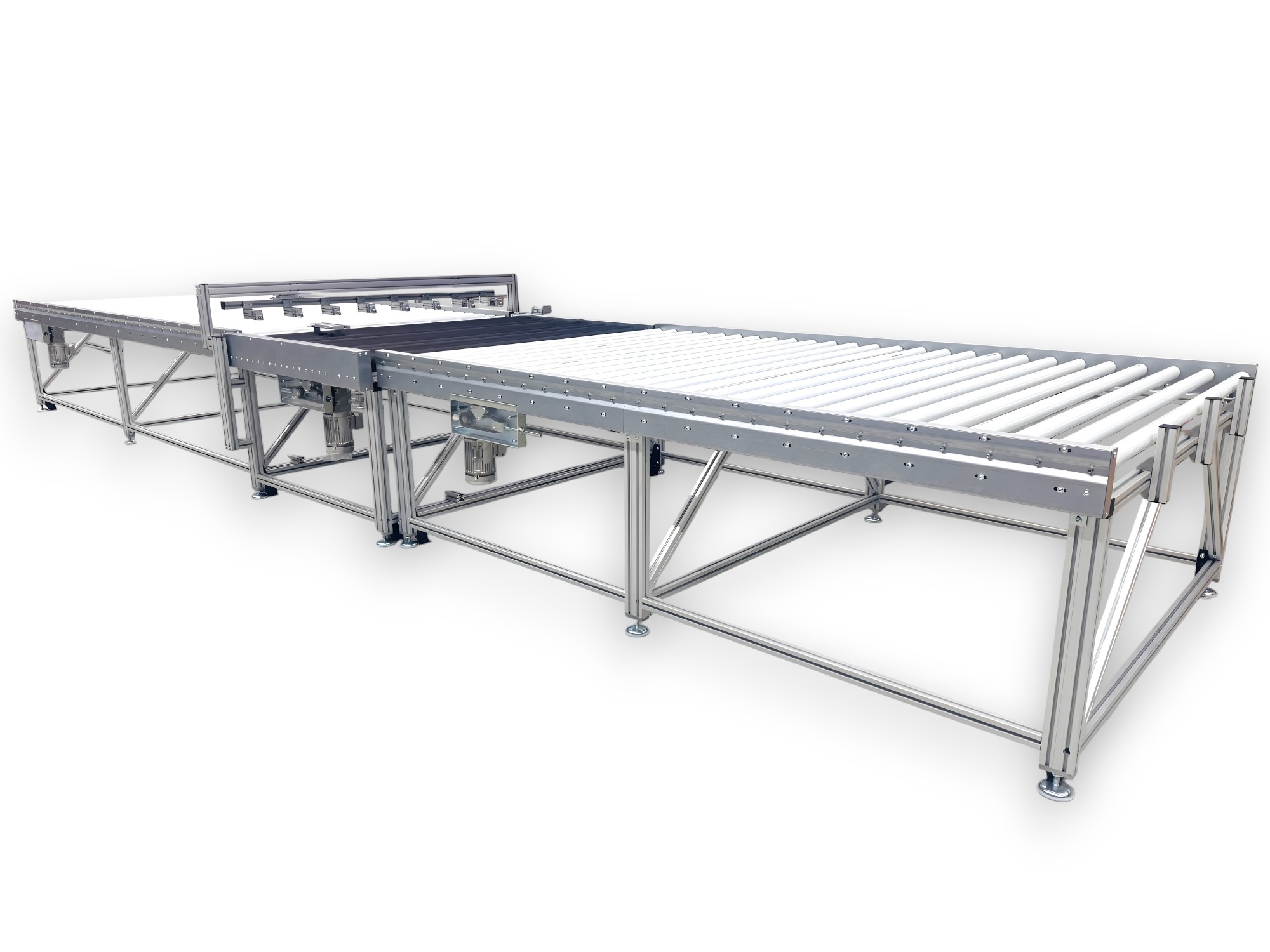 Die extrabreite Rollenbahn-Anlage dient dem automatisierten Transport großformatiger Kunststoffplatten über mehrere Prozessstationen. Sie gewährleistet einen kontinuierlichen Materialfluss und transportiert die Bauteile sicher und schonend.